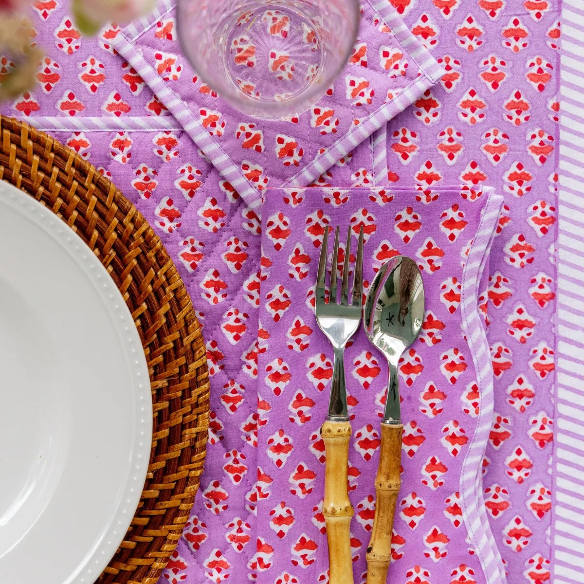 Cocktail hour gets extra festive with our exclusive blockprint quilted coasters. Handmade in India, the charming color combo and chic striped trim make a bold statement. Add to your own bar cart or they make an excellent gift