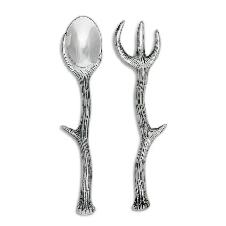 Stir up your signature salad with this unique Antler Serving Set from Arthur Court. The three-pronged fork and sturdy spoon both offer a point in the middle of the handle as a base to push against. Handcrafted in sand-cast aluminum, the set displays realistic detail in a naturally appealing design.
