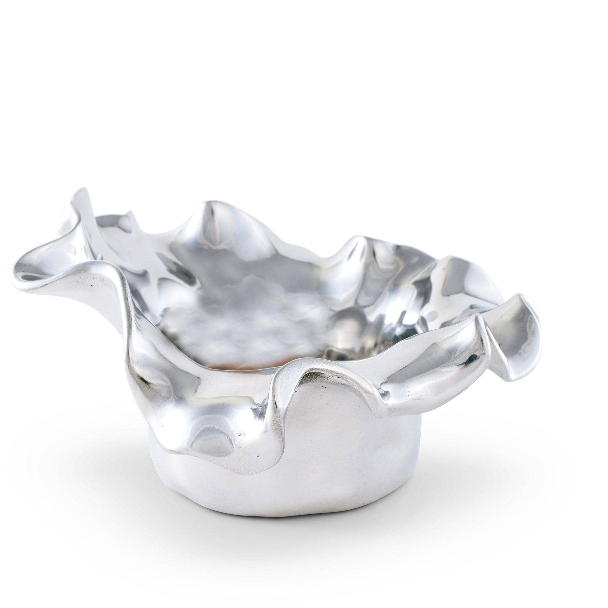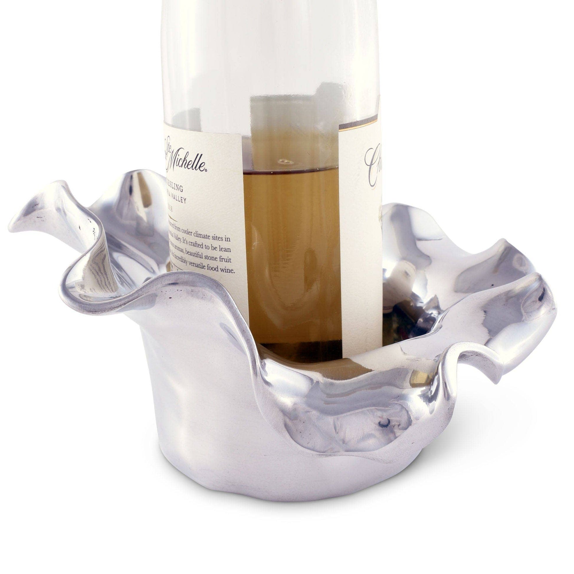 Keep your wine standing upright and ready for serving on this Arthur Court Carmel wine coaster that mimics the ocean's waves. Styled after the fairy tale village of Carmel-by-the-Sea in California, the 3-inch flowing edges of this coaster beautifully resemble the rolling waves of the Pacific Ocean. The flat bottom is large enough, at 7 inches in diameter, to hold a single wine bottle snugly so it won’t tip over and spill. This coaster will add a touch of the ocean to a nautical-themed dining room or bring back memories of vacations at the beach or outdoor barbecues by the sea. The strong aluminum alloy material provides long-lasting use, and the shiny silver color gives off a modern, elegant flair.