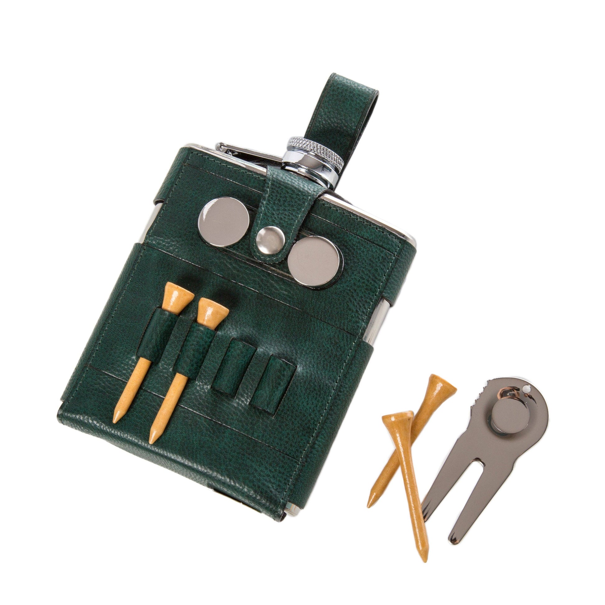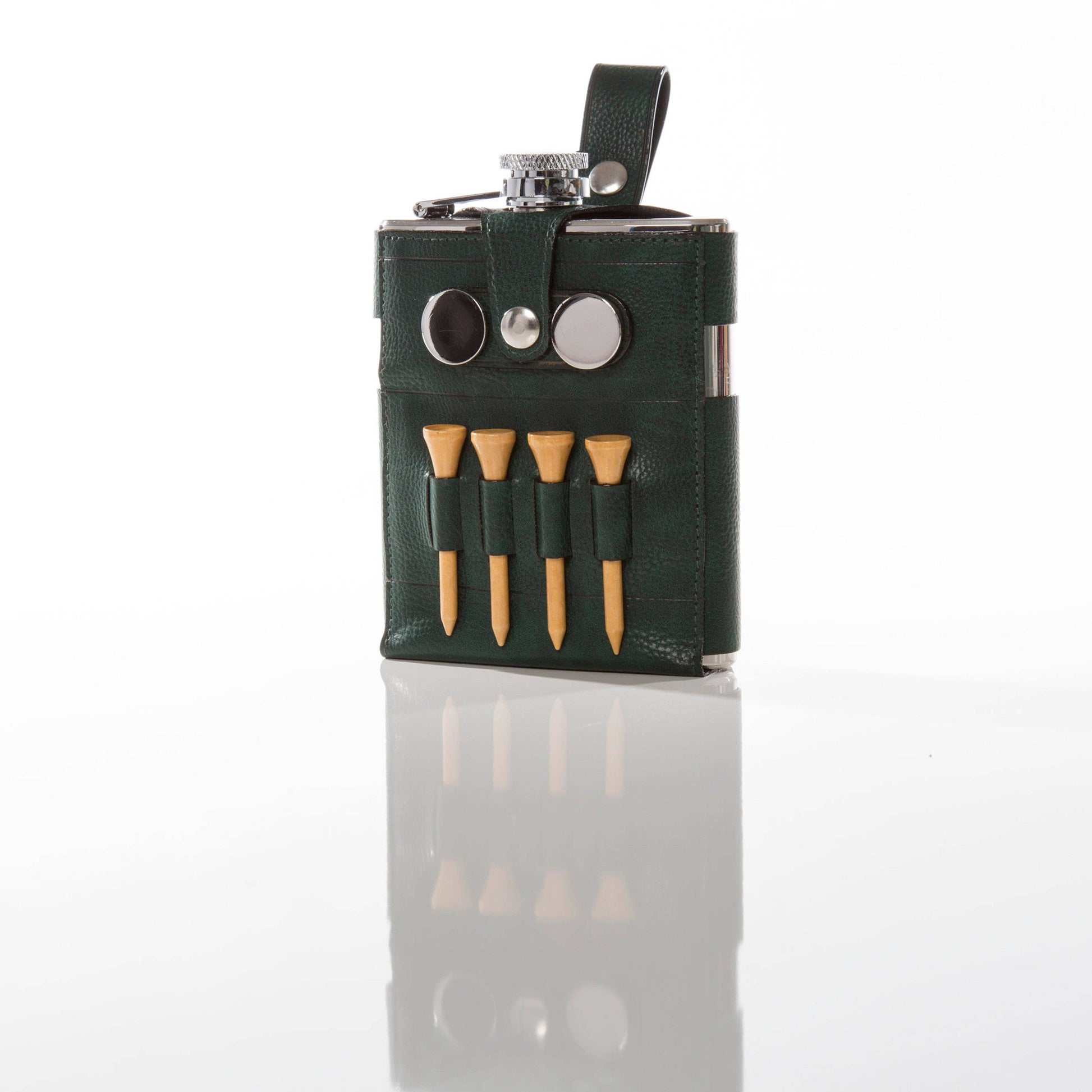 Get ready to tee up with this leather wrapped hip flask. For the indulgent golfer, this stainless steel flask features a belt loop for hands free action, tees, markers, and pitch: everything you need for the perfect afternoon on the course. Choose from black or green leather.